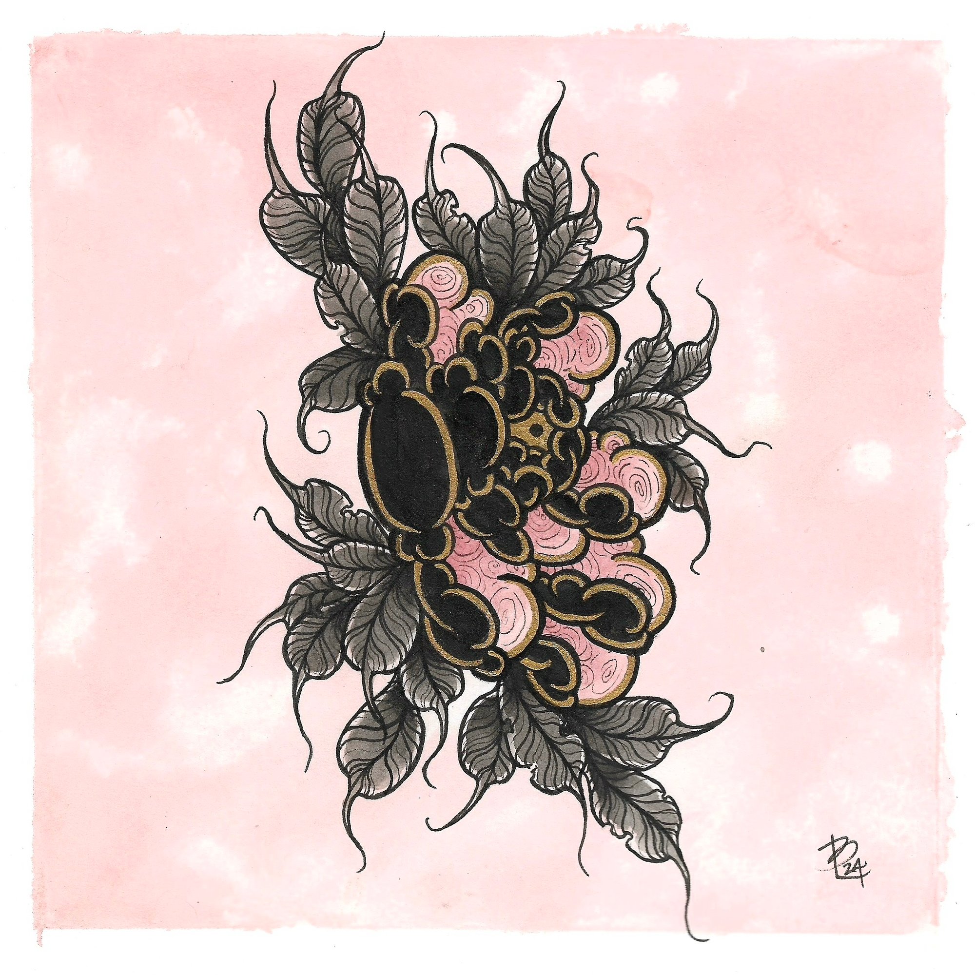 A bold and blooming peony rendered in black, blush pink, and shimmering gold. This original 8x8” painting by Lor Begent channels traditional Japanese tattoo influence into an intimate floral form that feels both timeless and mythic.