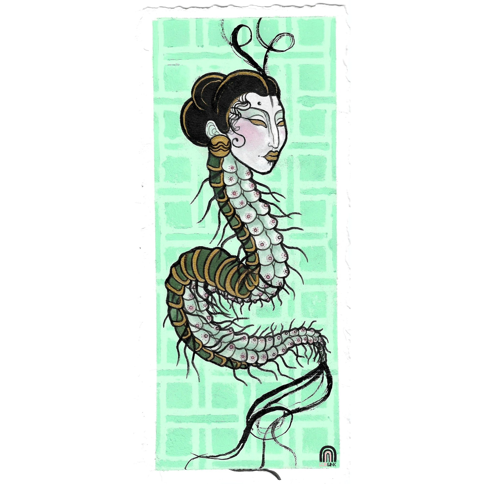 Painted on Arches hot press watercolor paper using archival-quality inks and paints, this elongated format highlights the seductive flow of the centipede’s body—melding sensuality, danger, and mystery.