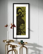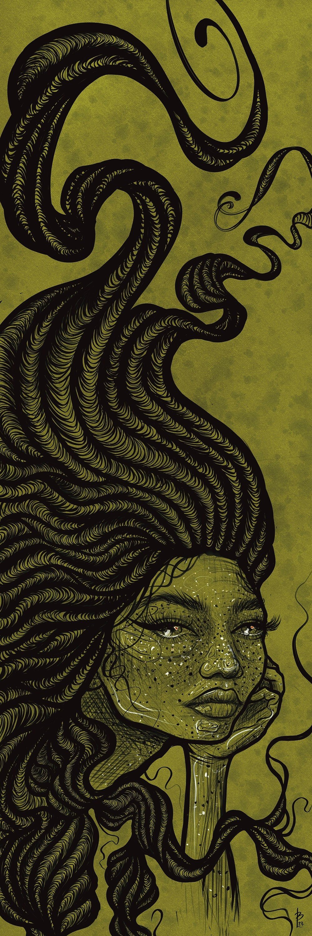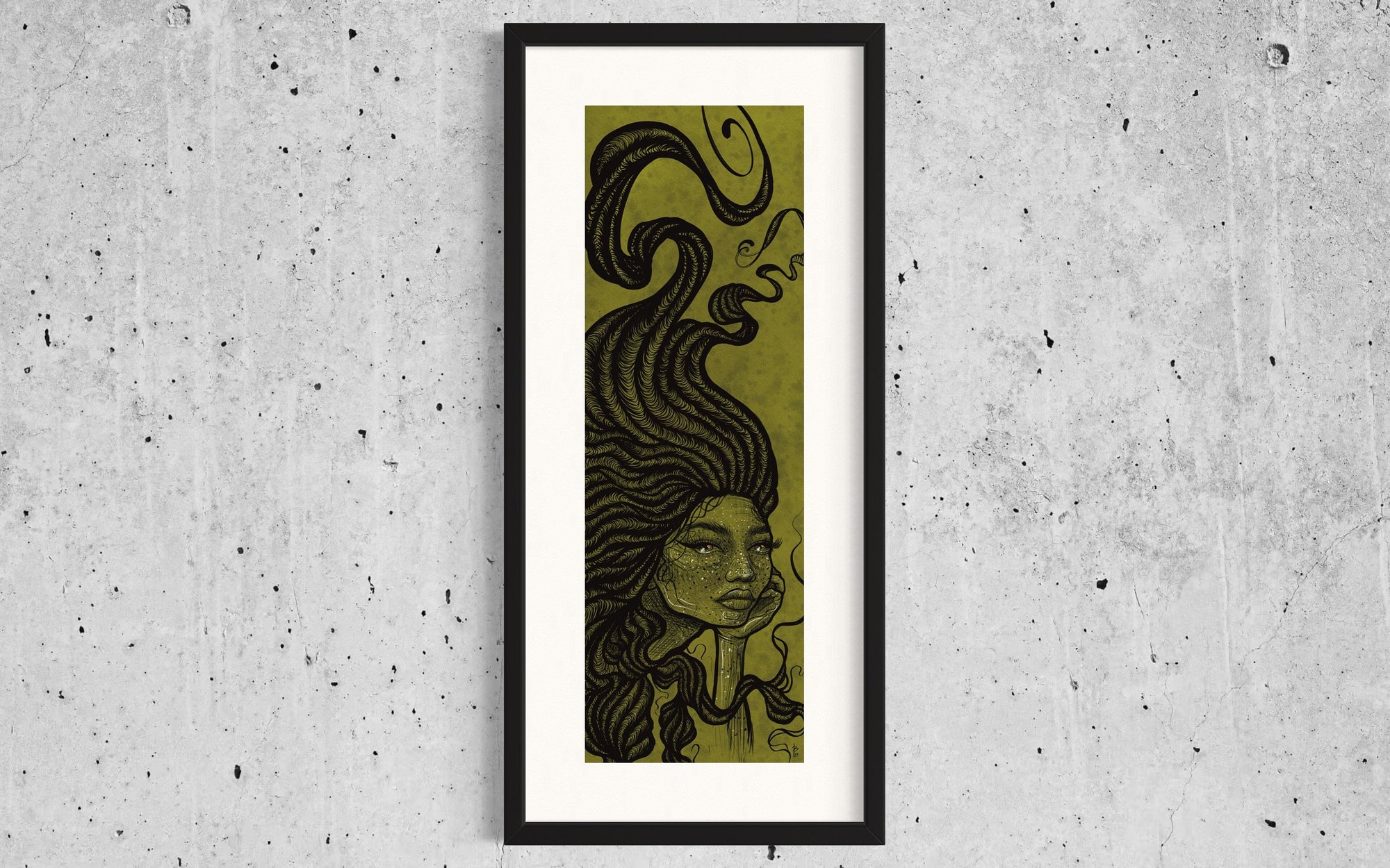 She holds steady while everything flows around her. Hair becomes pattern becomes architecture becomes something alive and moving. The intricate linework spirals upward in waves of ornate detail - Art Nouveau meets contemporary illustration, classic technique meets modern vision.