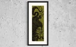 The vertical format makes this piece ideal for narrow wall spaces - entryways, between windows, stairwells - anywhere you want impact in a tall, elegant composition. The detailed linework rewards close viewing while maintaining visual strength from across a room.