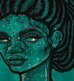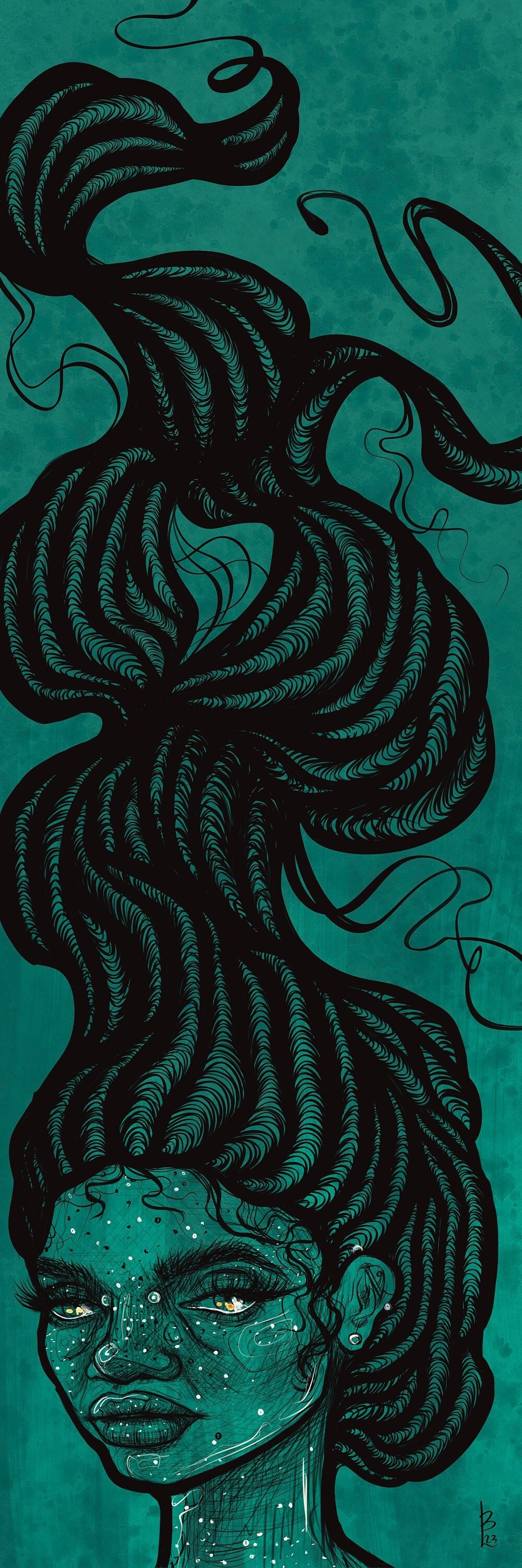 She holds steady while everything flows around her. Hair becomes pattern becomes architecture becomes something alive and moving. The intricate linework spirals upward in waves of ornate detail - Art Nouveau meets contemporary illustration, classic technique meets modern vision.