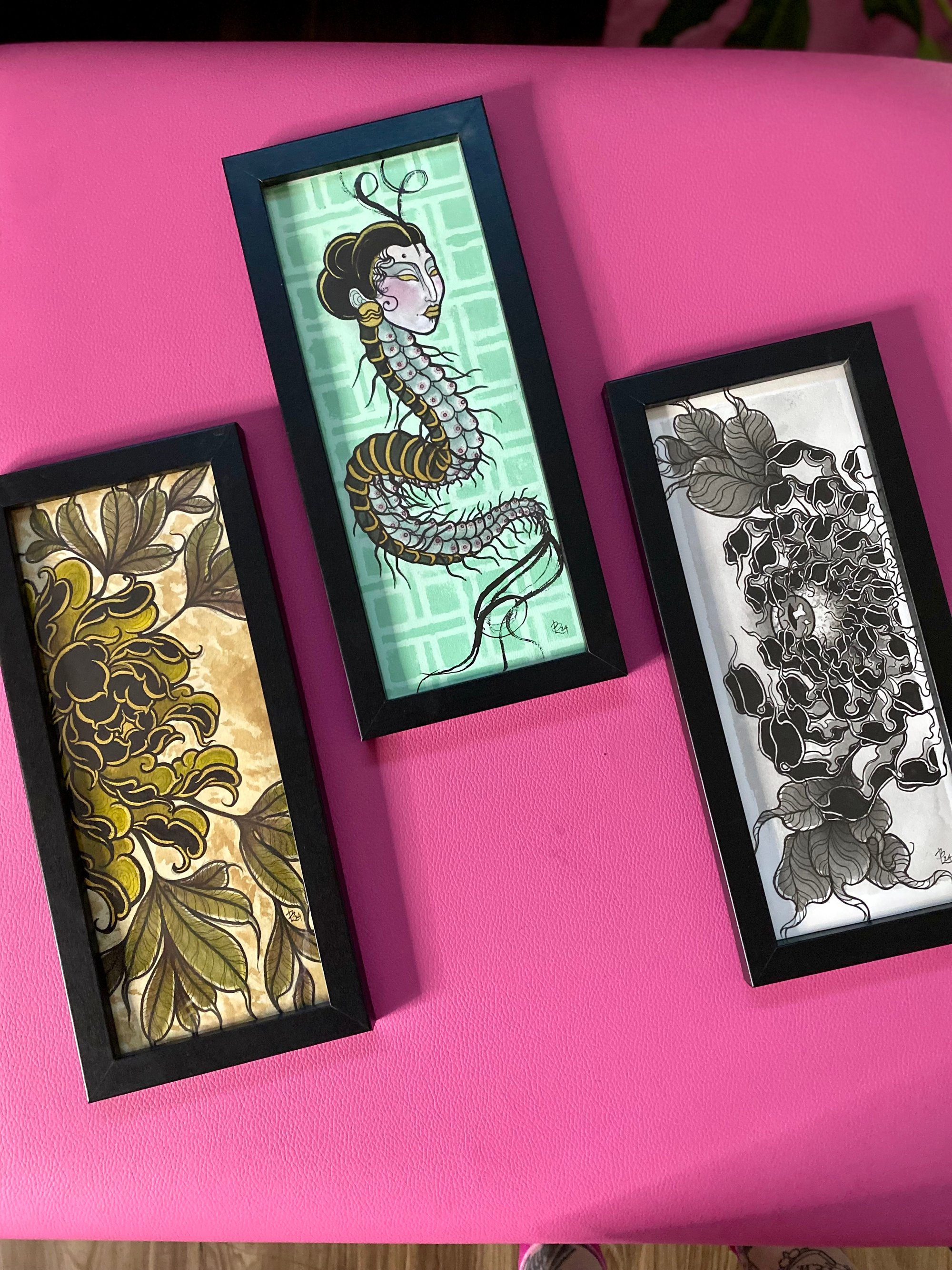 A swirling chrysanthemum unravels into something otherworldly, its petals forming hypnotic curves that draw you into a single, haunting eye at the center. Inspired by the bold flow of traditional Japanese irezumi, this 4x10 inch piece by Lor Begent blends meticulous ink linework with delicate watercolor shading to create a surreal sense of movement and unease.