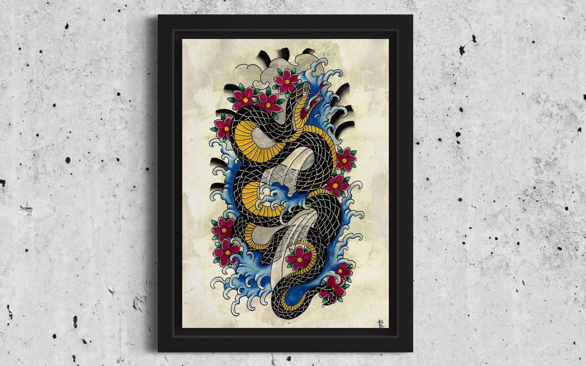 This 9x12 (with appx 1 inch white border included) archival fine art print was inspired by Japanese tattoo art (Irezumi), and painted with watercolor and ink by Lor Begent.