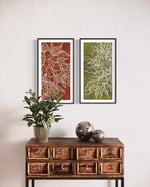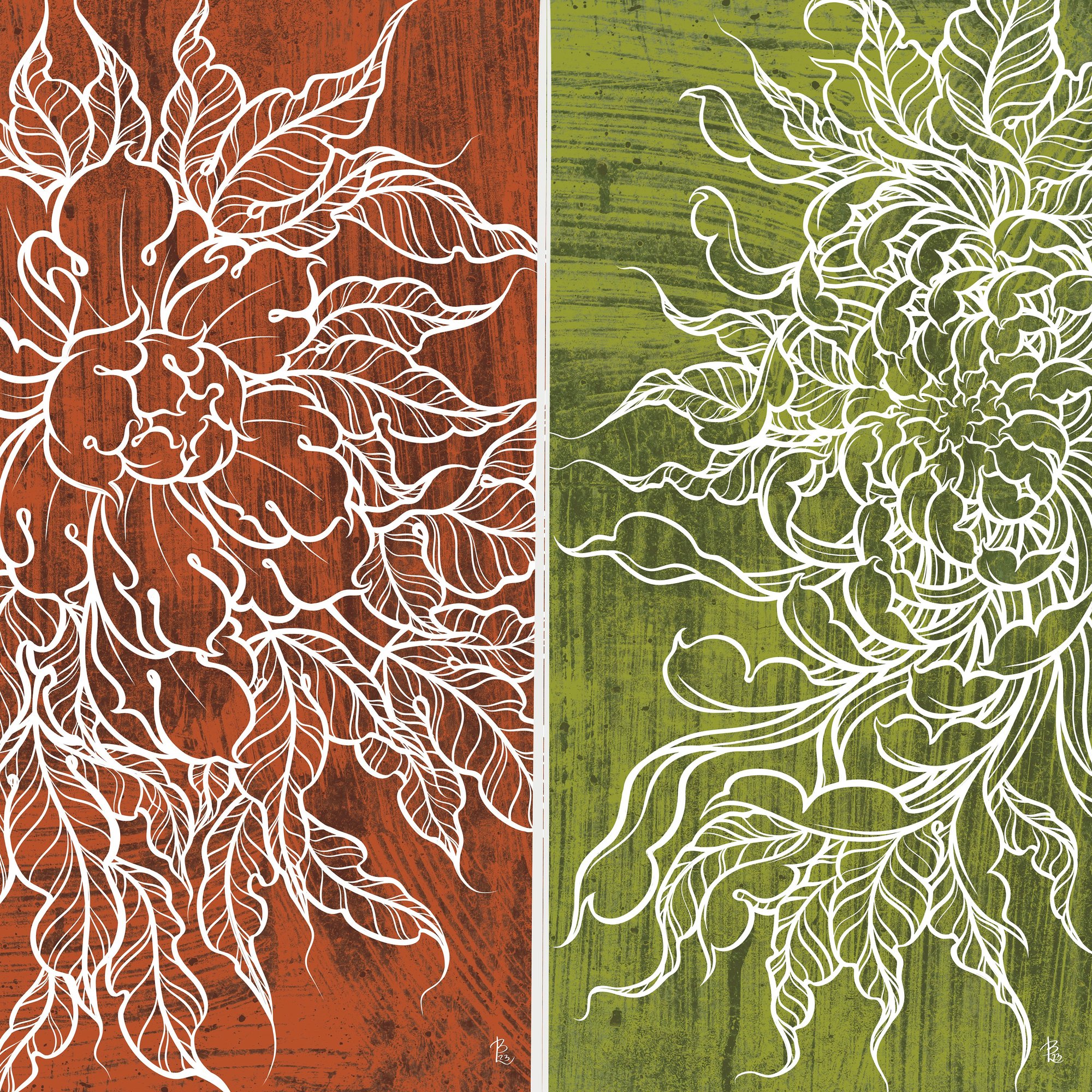 This 10x20" two piece archival illustration print set was created with love by Lor Begent. Featuring high contrast peony and chrysanthemumm on a burnt orange and sage green to add a pop of color and interest in your home.