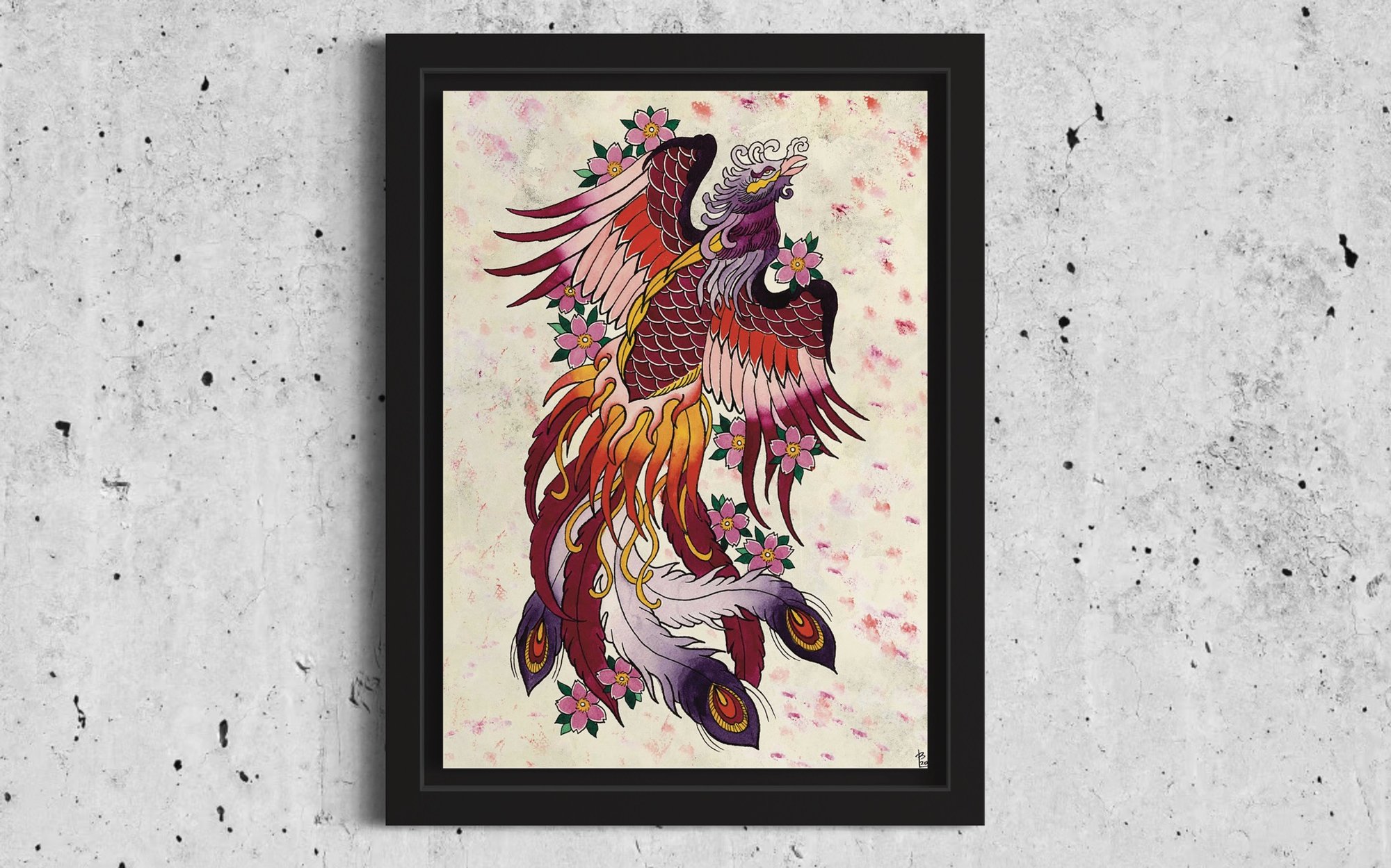 This 9x12 inch (with appx 1 inch white border) archival fine art print was inspired by Japanese tattoo art (Irezumi), and painted with watercolor and ink by Lor Begent.